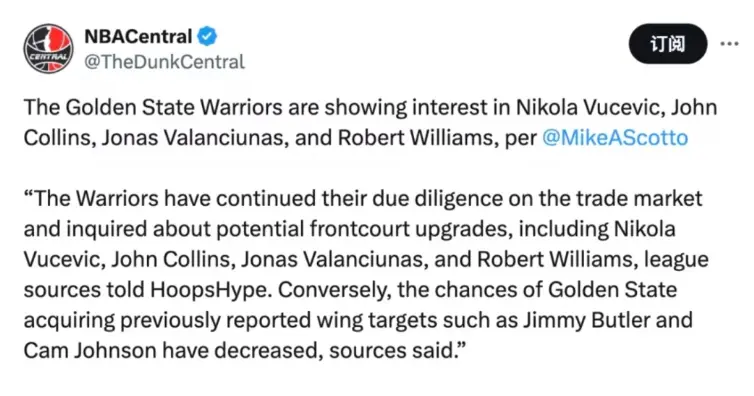 跟着NBA往返市集的周边,金州骁雄的引援动向引起了平淡怜惜。左证好意思媒HoopsHype记者Michael Scotto的最新报说念,骁雄当今将规画锁定在四名中锋身上,离别是芝加哥公牛的尼古拉·武切维奇、犹他爵士的约翰·科林斯、华盛顿奇才的瓦兰丘纳斯和波特兰开辟者的罗伯特·威廉姆斯。这一决议背后,骁雄料理层的考量不单是是补强威望,更是为了应酬球队在改日几个赛季可能濒临的竞争压力。